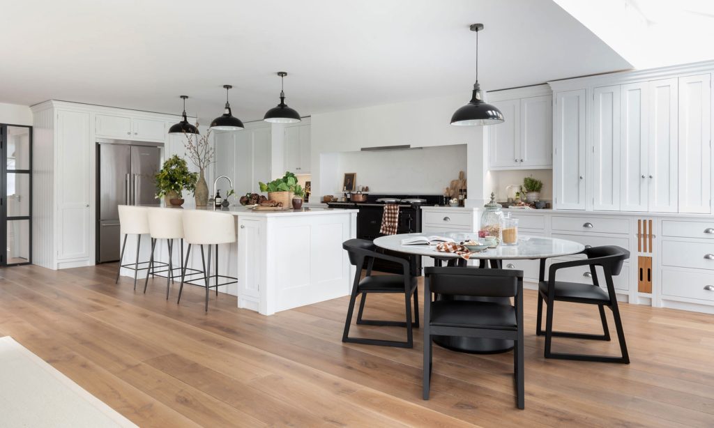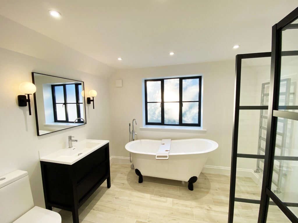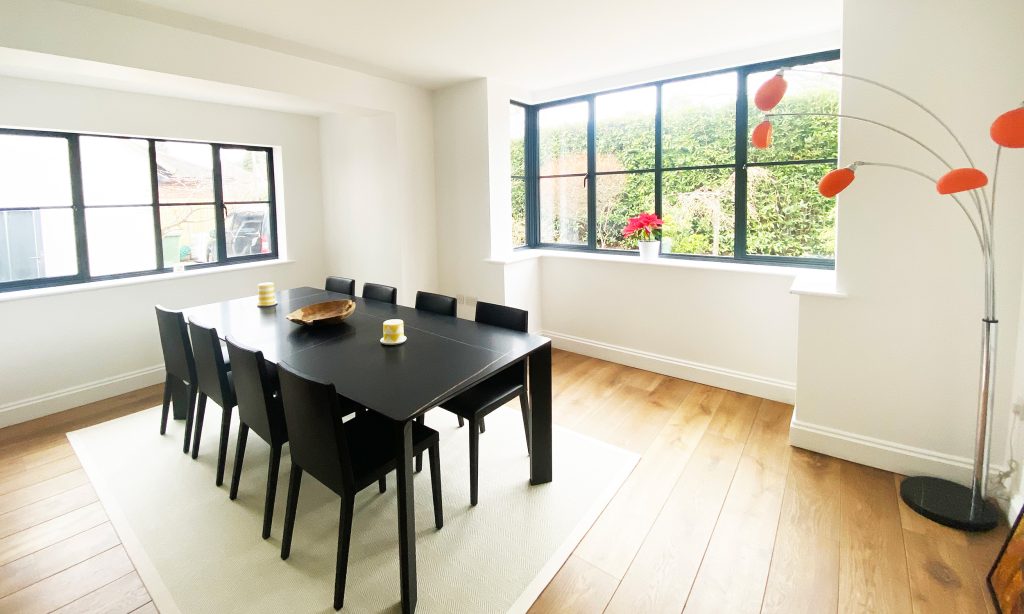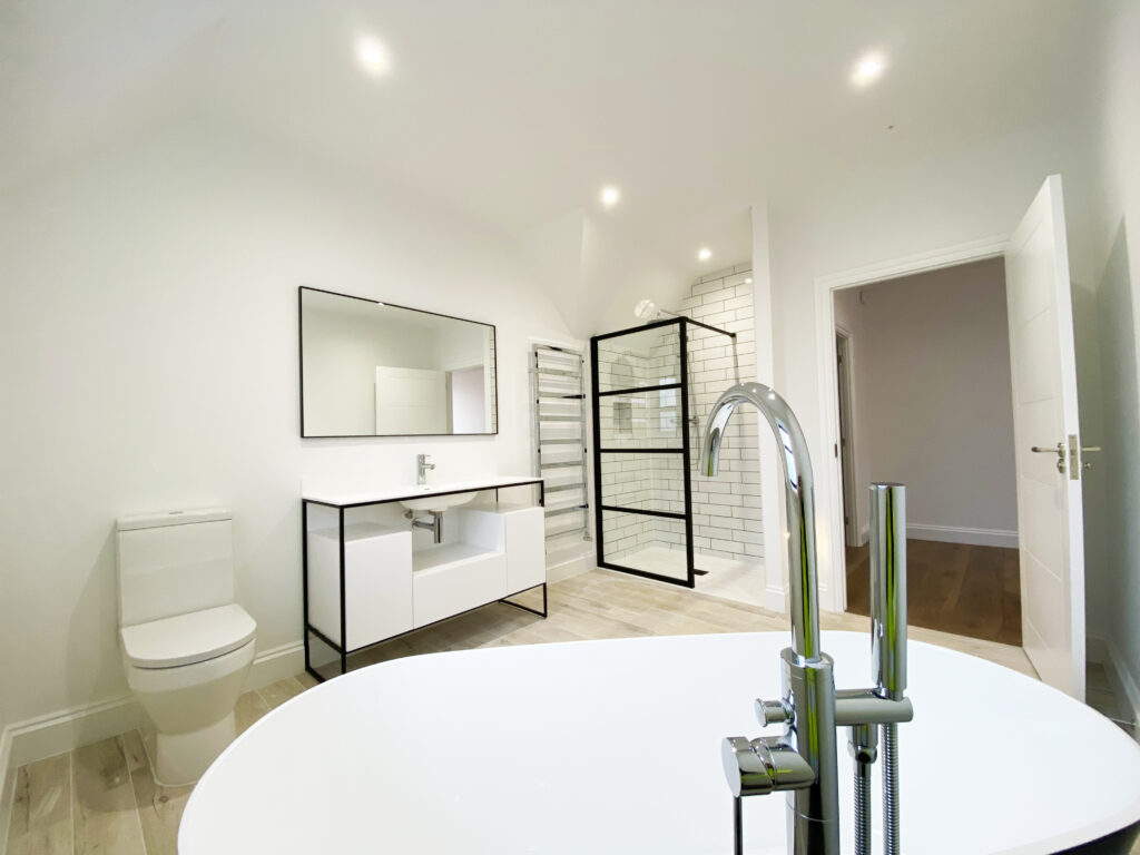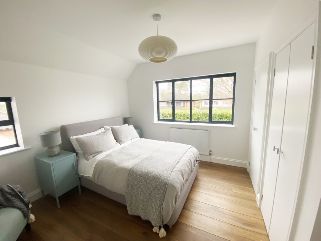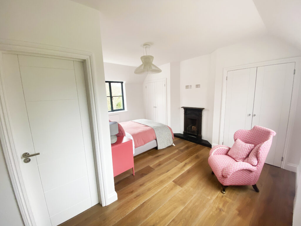 The existing house underwent full refurbishment, incorporating high-spec finishes such as smart aluminium windows, a tailored painted oak staircase, bespoke kitchen and utility areas, a gas fireplace, solid hardwood flooring, and modernized WCs and living spaces.
