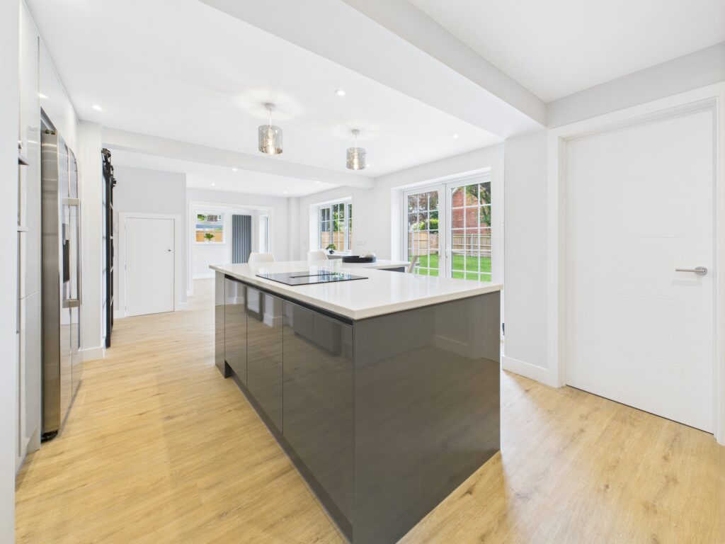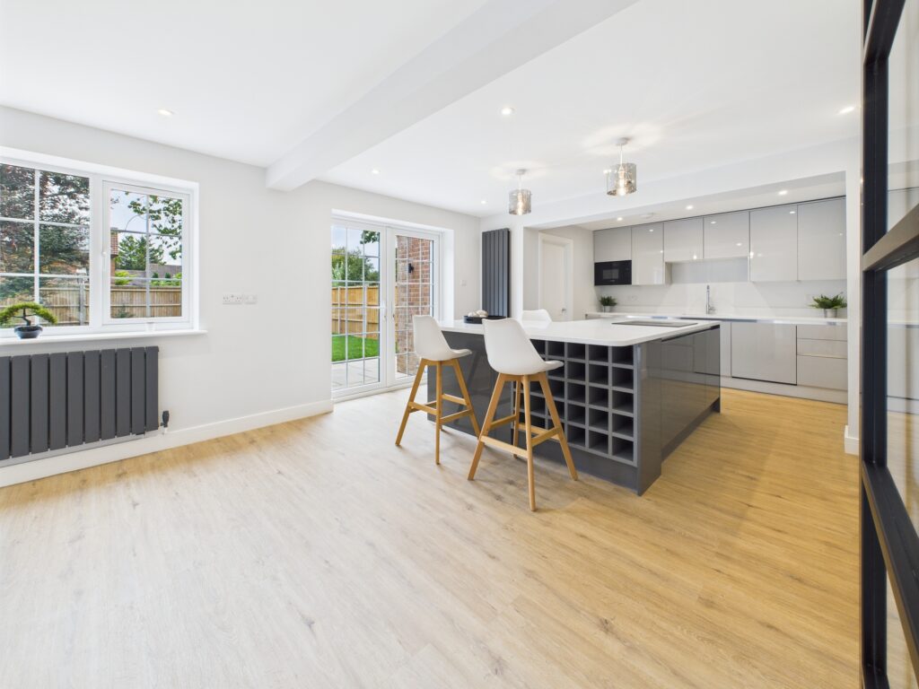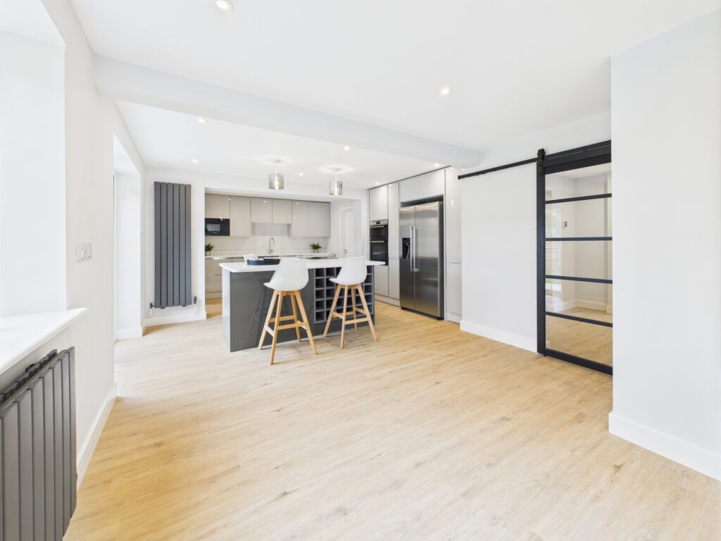 • Transformation of a dated property into a spacious, energy-efficient and modern family home, combining open-plan living with practical spaces such as a dedicated utility room and home office.