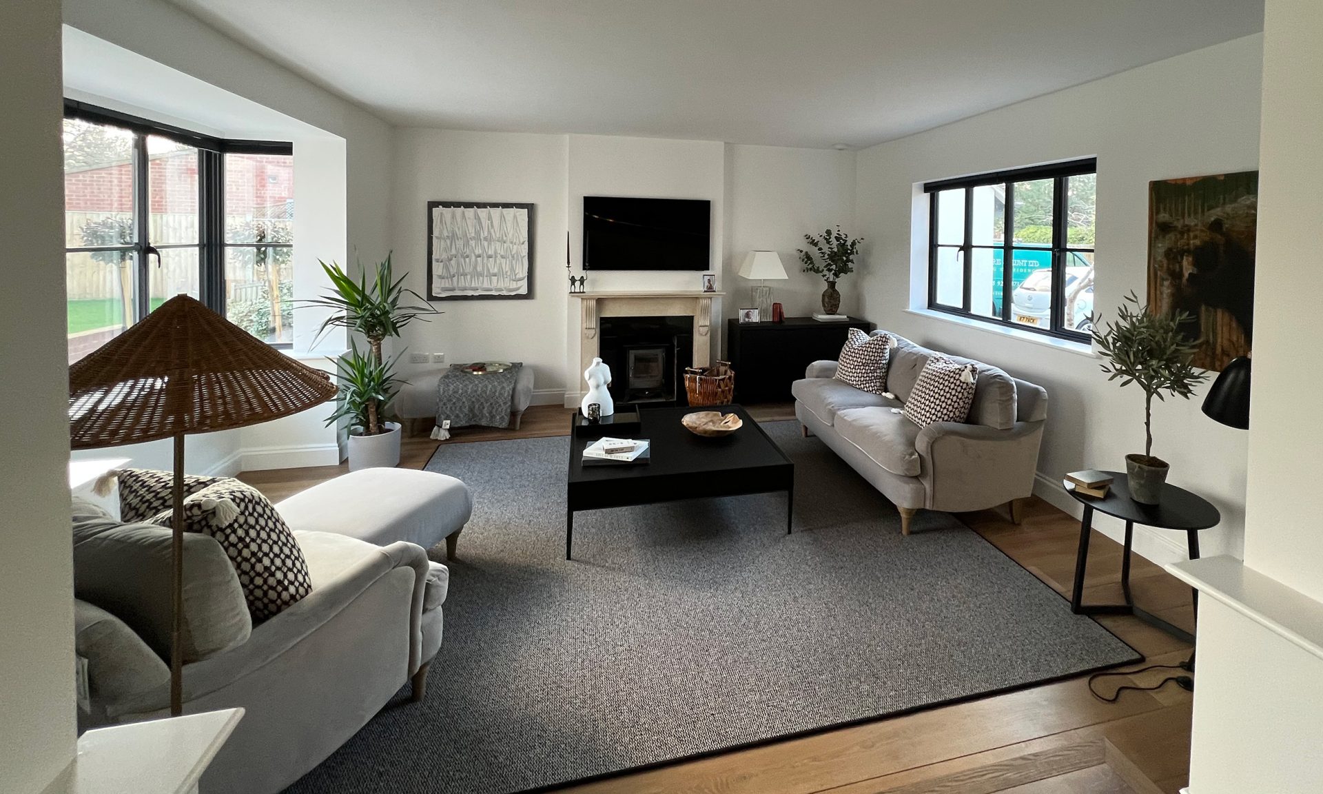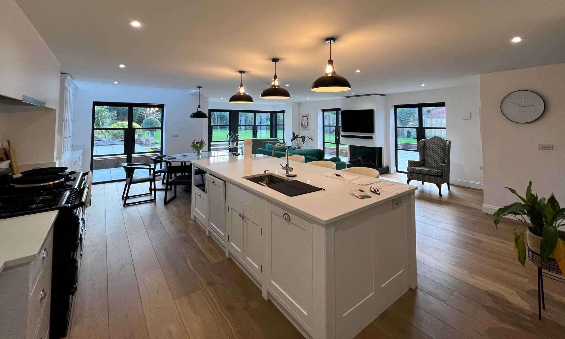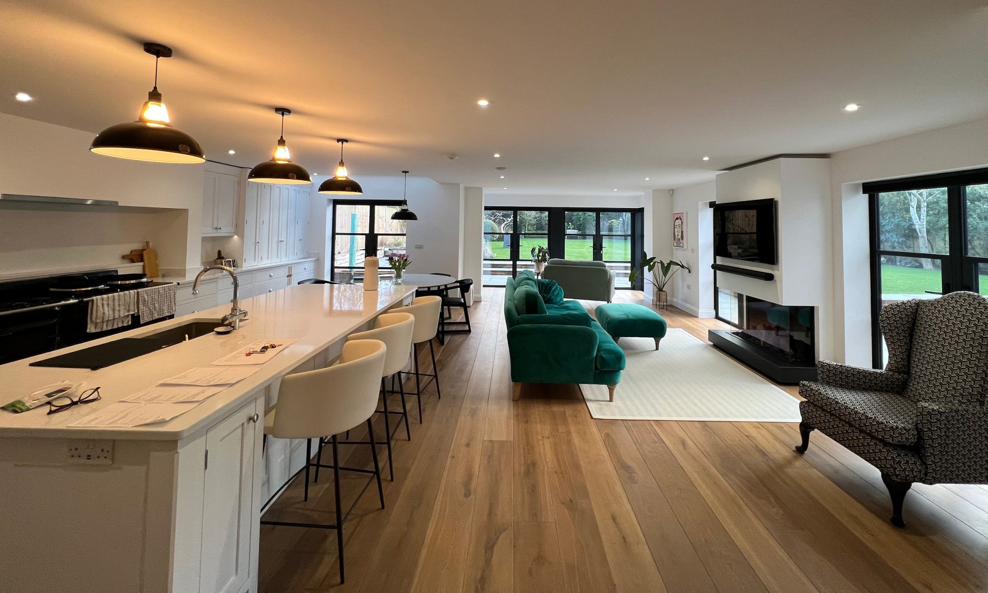 The existing house underwent full refurbishment, incorporating high-spec finishes such as smart aluminium windows, a tailored painted oak staircase, bespoke kitchen and utility areas, a gas fireplace, solid hardwood flooring, and modernized WCs and living spaces.