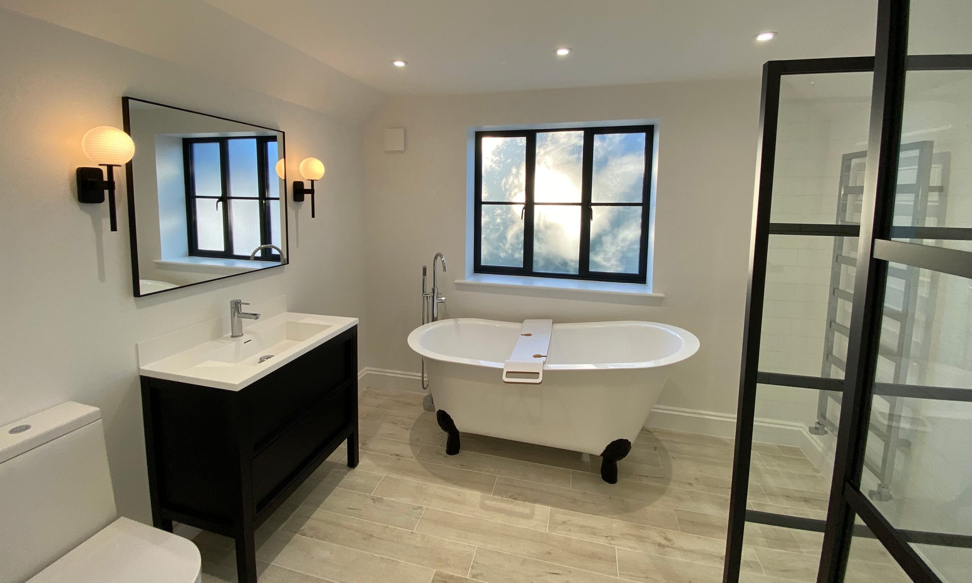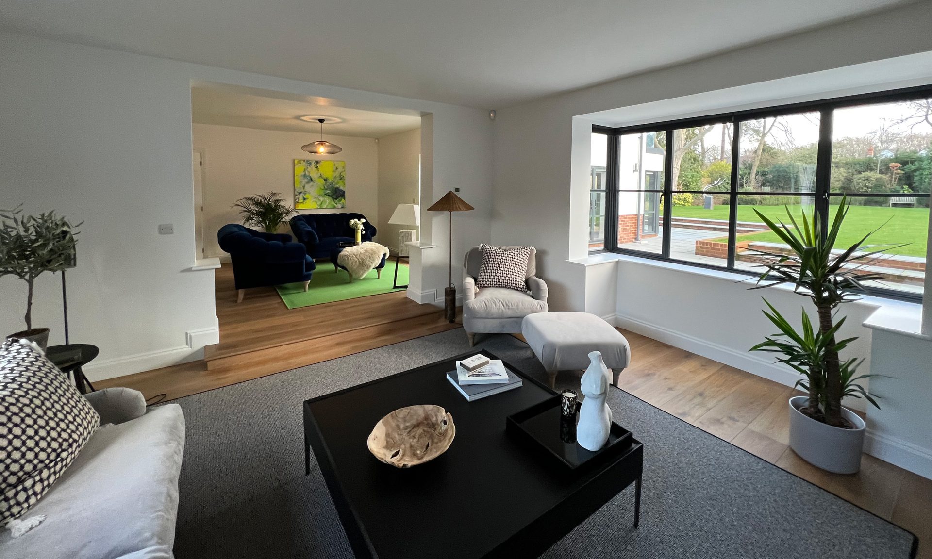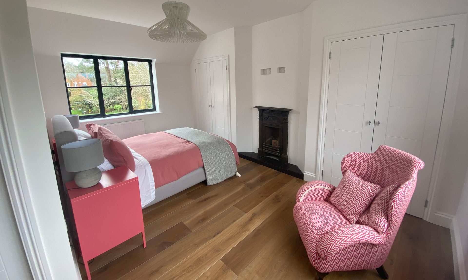 The existing house underwent full refurbishment, incorporating high-spec finishes such as smart aluminium windows, a tailored painted oak staircase, bespoke kitchen and utility areas, a gas fireplace, solid hardwood flooring, and modernized WCs and living spaces.