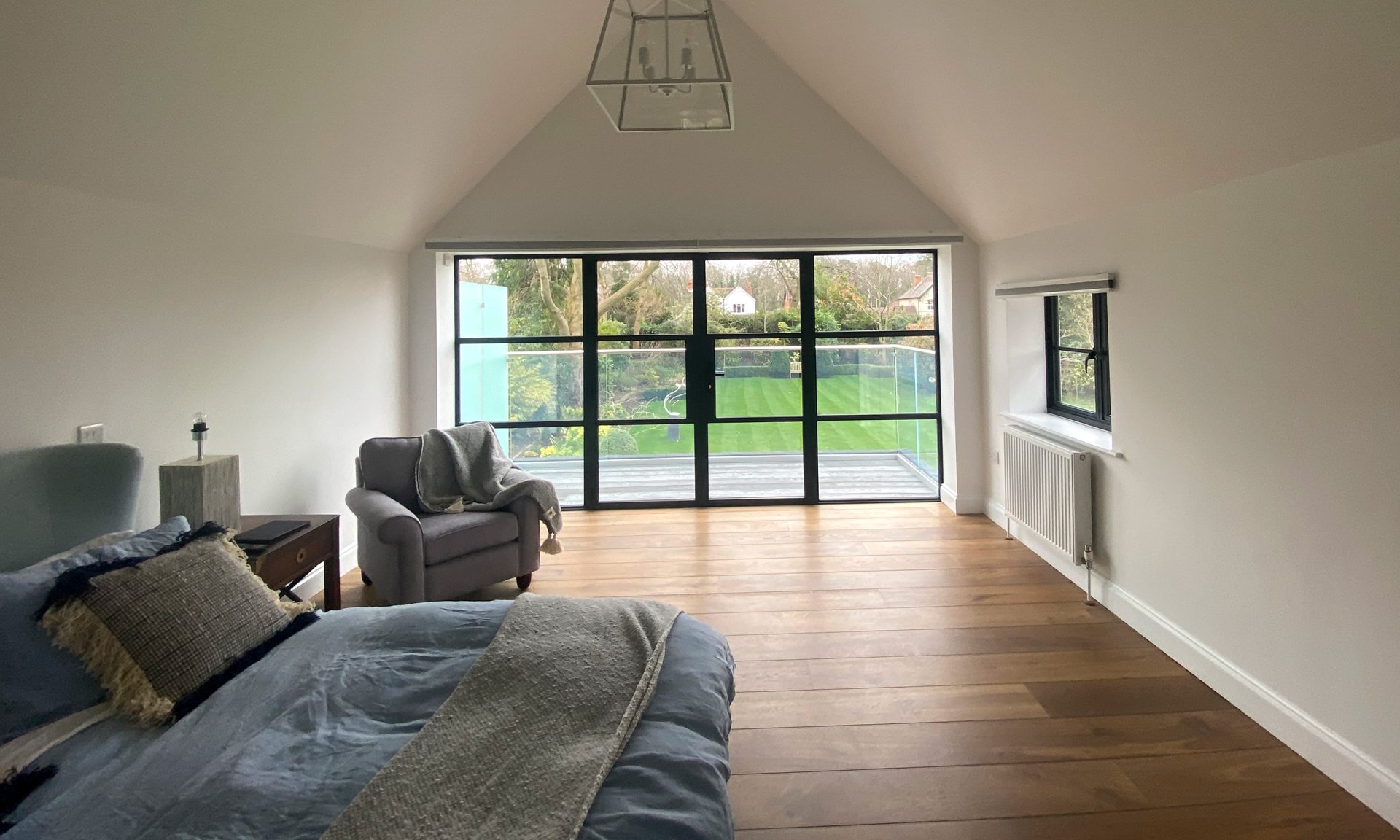 The new extension introduced an open-plan kitchen/family room, utility area, master bedroom with balcony, en-suite, family bathroom, dressing room, and additional bedroom. A vaulted ceiling with double windows and balcony access was added to the master bedroom, featuring bespoke handrails and glazing.